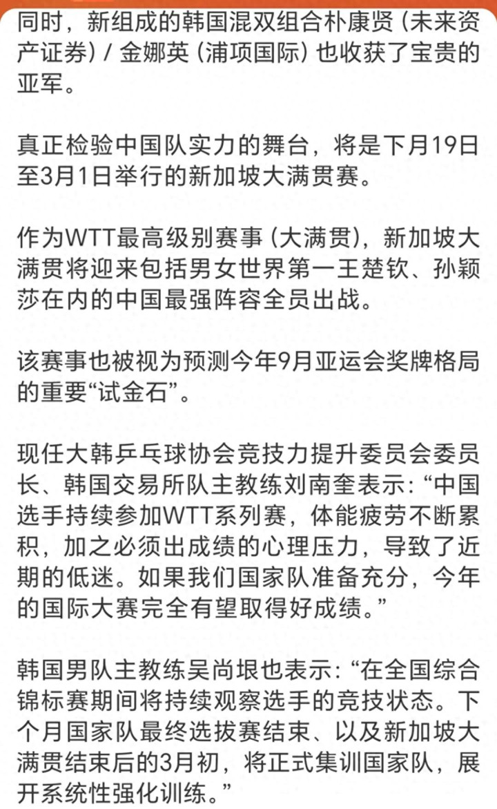 近日,现任大韩乒乓球协会竞技力提升委员会委员长、韩国交易所队主教练刘南奎表示接受采访时:“中国选手持续参加WTT系列赛,体能疲劳不断累积,加之必须出成绩的心理压力,导致了近期的低迷。如果我们国家队准备充分,今年的国际大赛完全有望取得好成绩。”