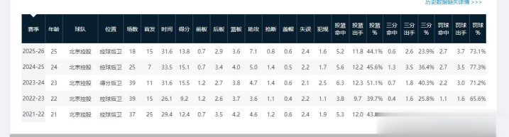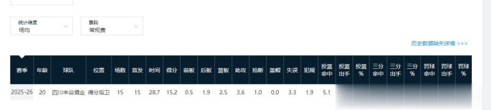 本赛季15次出场后,段睿骐场场首发,场均可出场28.7分钟,场均出手12.6次,这两项数据均为队内本土球员最高。他也不负众望,给球权就能做到消化,目前他场均可砍下15.2分2.5篮板3.6助攻。段睿骐尺寸足,而且掌握国内大多数后卫不具备的中距离跳投技术,他的上限应该会很高。